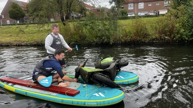 Tijdens de clean-ups kwamen er wederom opvallende en soms zelfs bizarre vondsten boven water. Verpakkingsmateriaal en blikjes van al tientallen jaren oud, waren een soort tijdcapsule van ons consumptiegedrag. Het is opmerkelijk hoe deze objecten zo lang onaangeroerd in het water kunnen blijven, terwijl ze tegelijkertijd laten zien hoe zorgeloos afval soms wordt achtergelaten. Een stortvloed aan fietsen en winkelwagens vormden de ‘klassiekers’, extra zorgelijk is dat er wederom een deelscooter uit het water werd gehaald.